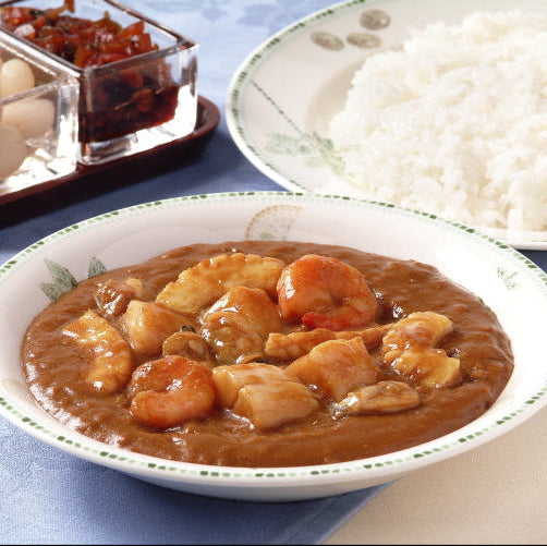 海老、イカ、アサリを完熟トマトと伝統のソースで煮込んだコクのあるシーフードカレーです。