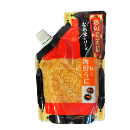 えのき茸(国産)、醤油、砂糖、うに、異性化液糖、発酵調味料、香辛料/調味料(アミノ酸等)、トレハロース、増粘多糖類、酸味料、酸化防止剤(ビタミンC)、リン酸塩(Na)※一部に大豆、小麦を含む